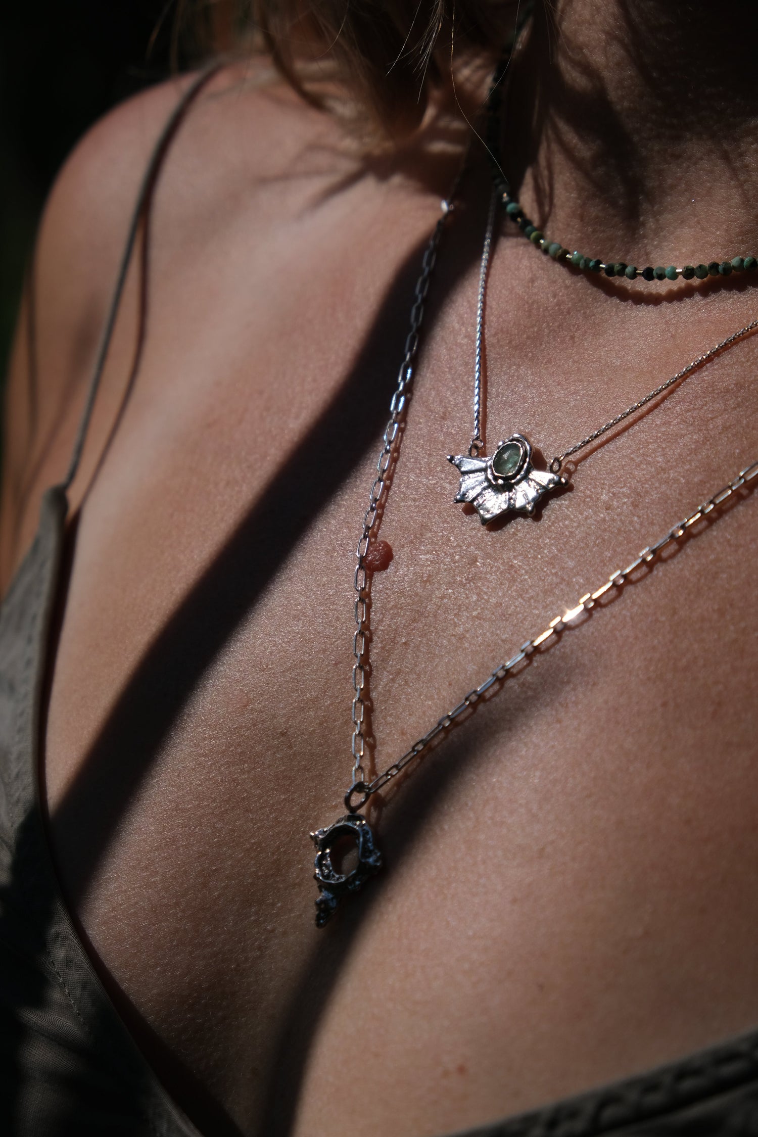 My relationship with jewelry began early, rooted in a lifelong fascination with crystals and gemstones. What started in 2018 as a simple exploration of beaded designs gradually evolved into a deep dedication to metalworking and the art of hand fabrication.