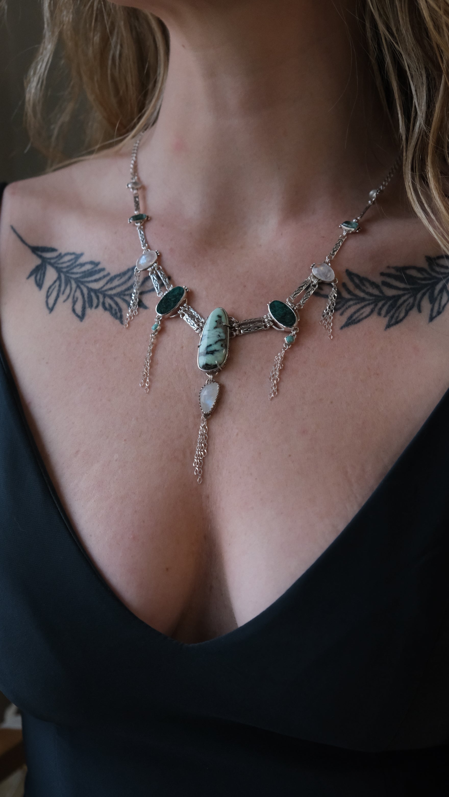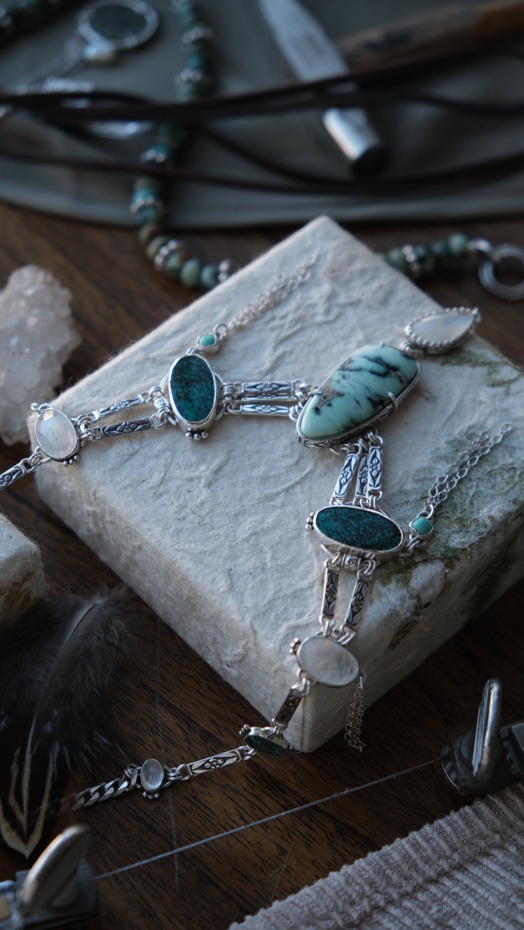 - Natural stones; Angel Wing Variscite, Hubei Turquoise, Chilean Turquoise, Moonstones, & Kyanites
